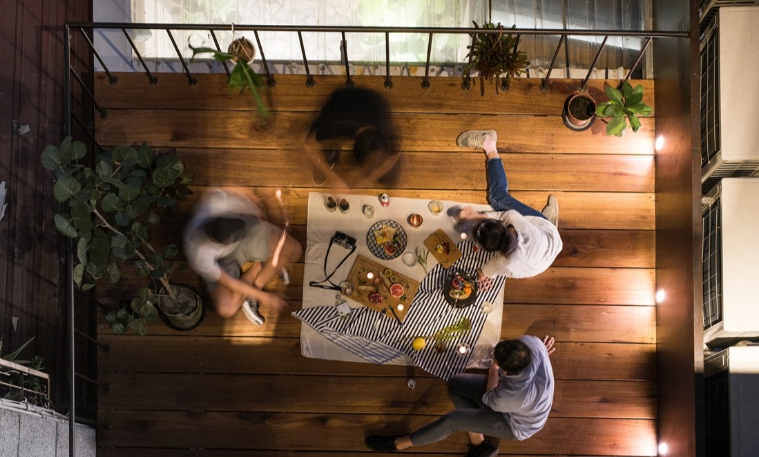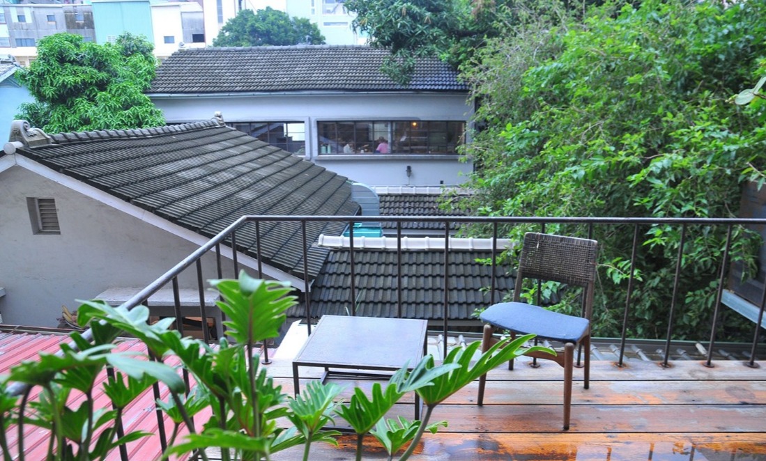 管家在2樓櫃台接待旅人,公共空間大,擺放了藝術畫作、書籍、會議長桌椅、店家標註的台南旅遊地圖與茶水區等,還有一個鬧中取靜,能眺望藍晒圖文創園區的大露臺。一邊是新光三越現代大樓,另一邊是日風瓦片木構小屋,相映成趣。