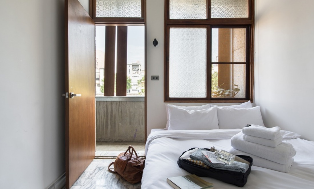 3樓是女生專屬的背包客房,因為安全性高又舒適,相當受閨蜜團青睞。乾濕分離的淋浴空間明亮整潔,寬度夠不拘束,也有一個放置植栽的小陽台讓人休息。5樓則是樓中樓的家庭房格局、4樓還有一間雙人房,老屋原有的陽台狹小,重新設計時特別退縮了房內空間,讓客人能享受舒適陽台風景。